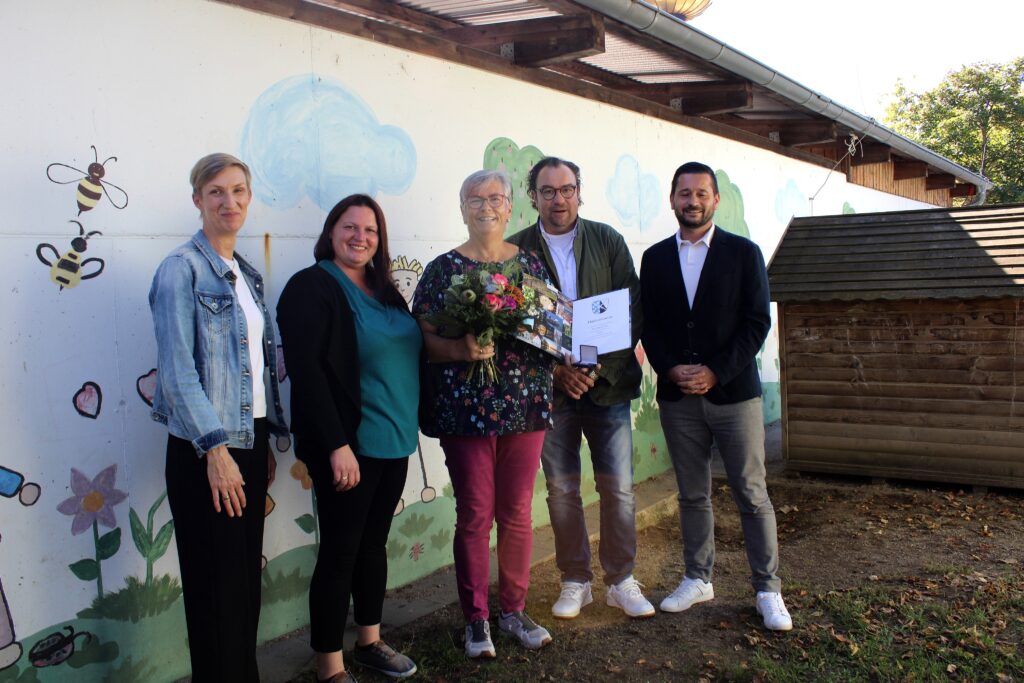 Als Anerkennung für ihre Verdienste erhielt Ingrid Götz eine Urkunde, eine Goldmünze und einen bunten Blumenstrauß. Gemeinsam mit dem Team des Kindergartens wurde dieses besondere Jubiläum feierlich gewürdigt – ein Zeichen der Wertschätzung für vier Jahrzehnte gelebte Verbundenheit im Kindergarten Lummerland.